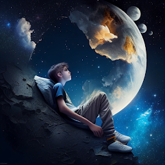 The young boy on the crescent moon believes in the power of imagination. He believes that anything is possible if you can imagine it. He uses his imagination to create new worlds and creatures, and he believes that his imagination is the key to unlocking the secrets of the universe. One of his favorite pastimes is creating new worlds in his mind. He imagines planets with towering mountains, vast oceans, and exotic creatures. He believes that his imagination is what fuels his curiosity and drives him to explore new frontiers.